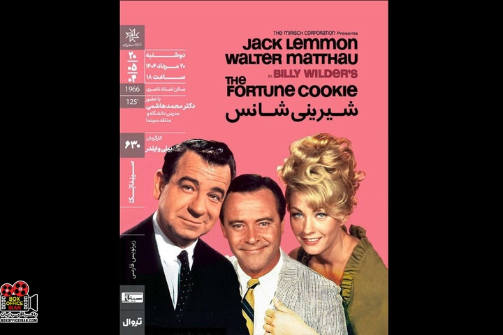 به گزارش باکس افیس ایران: فیلم سینمایی «شیرینی شانس» به کارگردانی بیلی وایلدر در خانه هنرمندان اکران و نقد میشود. در ششصد و سیامین برنامه سینماتک خانه هنرمندان ایران فیلم سینمایی «شیرینی شانس» (۱۹۶۶) ساخته بیلی وایلدر ساعت ۱۸ دوشنبه ۲۰ مرداد در سالن ناصری این مجموعه به نمایش درمیآید.