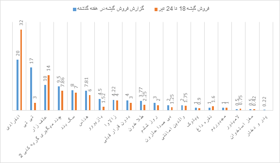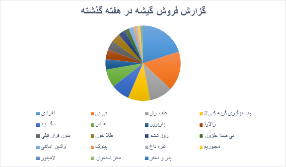 در هفتهای که گذشت مجموع فروش فیلمهای سینمایی ۱۲ میلیارد و ۵۰۰ میلیون تومان بود و در مجموع ۴۲۶ هزار ۲۶ نفر به تماشای فیلمهای سینمایی نشستند. این در حالی است که در هفته پیش از آن (۱۸ تا ۲۴ تیر) مجموع فروش فیلمهای سینمایی ۹ میلیارد و ۸۰۰ میلیون تومان بود و در مجموع ۳۰۶ هزار ۶۷۸نفر به تماشای فیلمهای سینمایی نشسته بودند این نشان میدهد که اکران سه فیلم سینمایی «تیتی» به کارگردانی آیدا پناهنده، «بازیووو» به کارگردانی امیرحسین قهرایی و «پیتوک» به کارگردانی سید مجید صالحی در دو هفته گذشته و «پدر و دختر» به کارگردانی خسرو ملکان در هفته گذشته، به گیشه سینماها کمی کمک کرده است