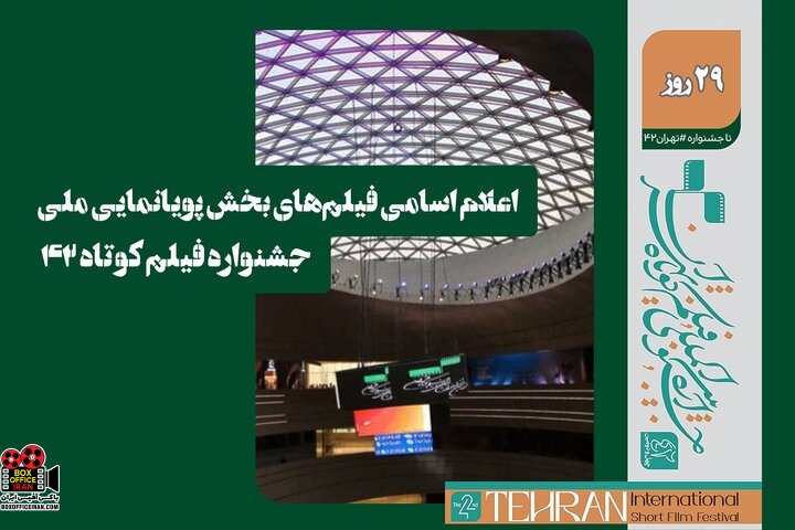 به گزارش باکس افیس ایران: اسامی فیلمهای پویانمایی بخش مسابقه ملی چهل و دومین جشنواره بینالمللی فیلم کوتاه تهران اعلام شد. اسامی فیلمهای پذیرفته شده در بخش پویانمایی مسابقه ملی چهل و دومین جشنواره بینالمللی فیلم کوتاه تهران اعلام شد.