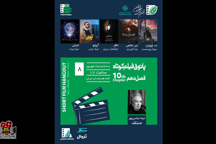 در این برنامه، فیلمهای کوتاه «دد چوپان» ساخته سهیلا پورمحمدی، «تیر خلاص» ساخته رضا گودرزی، «ناظر» ساخته ابوالفضل عزیزی، «آپولو» ساخته فرزاد رنجبر از ایران و فیلم کوتاه «تابش» ساخته فیونا بولت از کشور فرانسه روی پرده میرود.