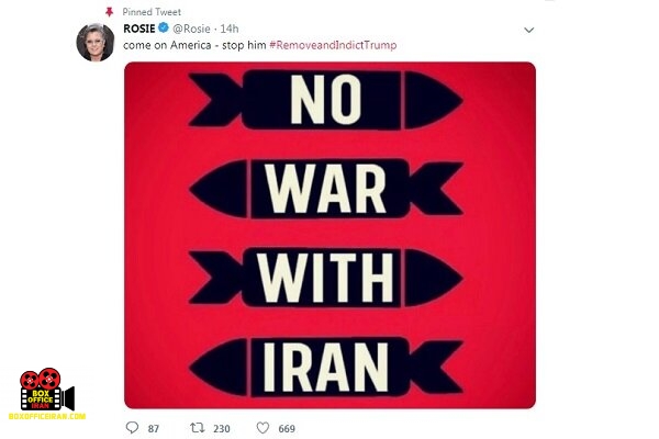 رزی اودانل کمدین، تهیهکننده و نویسنده ۵۷ ساله که از وقتی نوجوان بود در دهه ۱۹۸۰ با سریالهای تلویزیونی دیده شد در توییترش نوشته است: «جنگ با ایران نمیخواهیم.» وی در توییت دیگری خطاب به مردم آمریکا نوشته: «آمریکا بیا و او را (ترامپ را) متوقف کن.»